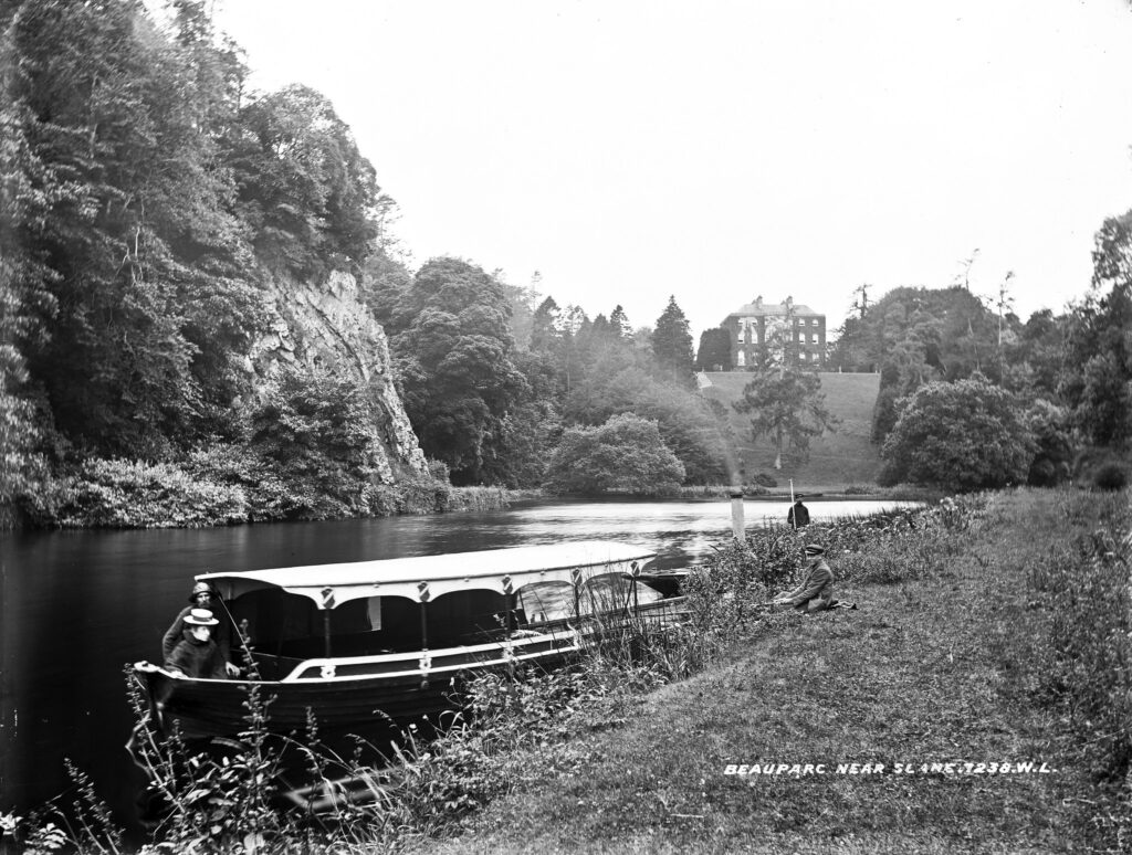 Retaining all her life an affection for the house, lording it over the Boyne, the mansion was built in the 1750s for the Lambart family, who retained it until the last Lambart, Sir Oliver, ‘a wonderful if somewhat retiring and eccentric individual’, died in 1986, leaving it, to the new owner’s ‘total and utter astonishment’, to Henry Conyngham, 8th Marquess Conyngham (born 25 May 1951) – dubbed (Wikipedia): ‘…. the rock and roll aristocrat or the rock and roll peer owing to the very successful series of rock concerts he has hosted since 1981, held in the natural amphitheatre in the grounds of Slane Castle [Slane falls within the estate, a few miles away across the river]… These concerts have included performances by The Rolling Stones, Thin Lizzy, Queen, U2, Bob Dylan, Bruce Springsteen, David Bowie, Guns N’ Roses, Oasis and Madonna.’