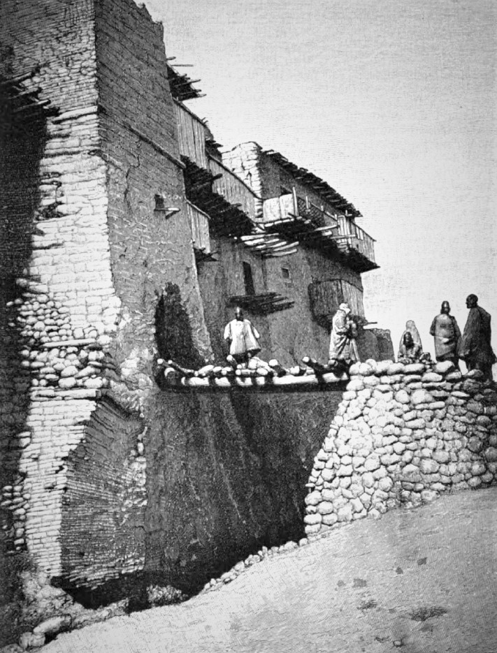 There is a gradual ascent in a southerly direction from the post-house, which is situated at the northern end of the rock; we passed by enclosures for the cattle of the community and deep caves, where the newly-born of goats and sheep were skipping and bleating, until at the south end of the rock a spot is reached where the ground is so high that by a rickety bridge you can cross a chasm, and enter the town through a hole in the wall; in former years there was a drawbridge, now there is only a frail thing made of trees, which requires a good head and firm step to cross. This is the only approach to the town.