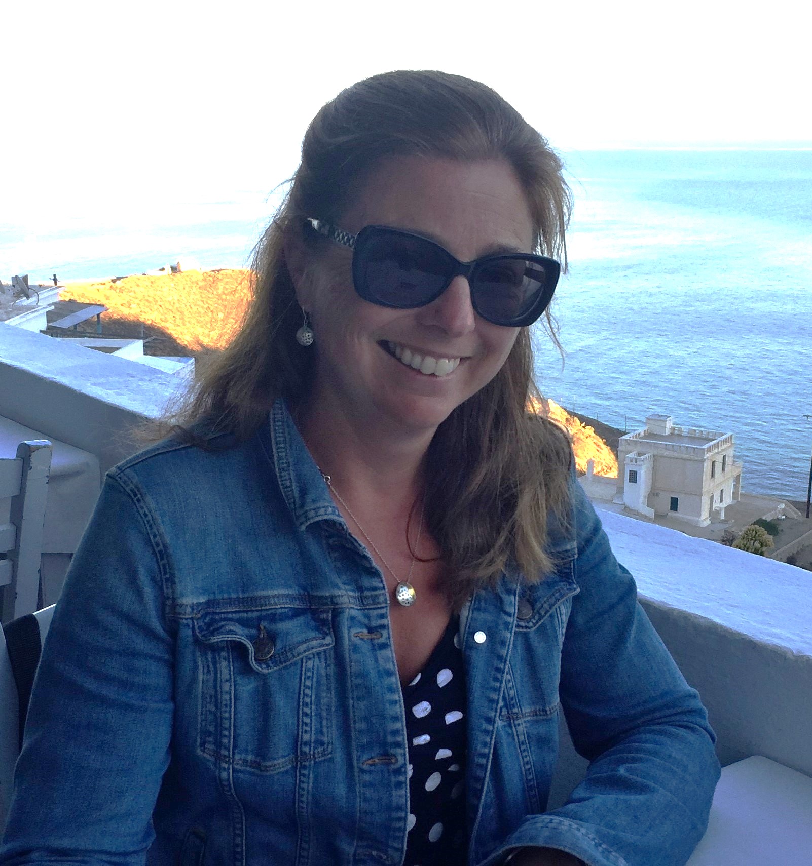 Travel writer Jennifer Barclay reads the Bents on Santorini (photo = Ian smith).