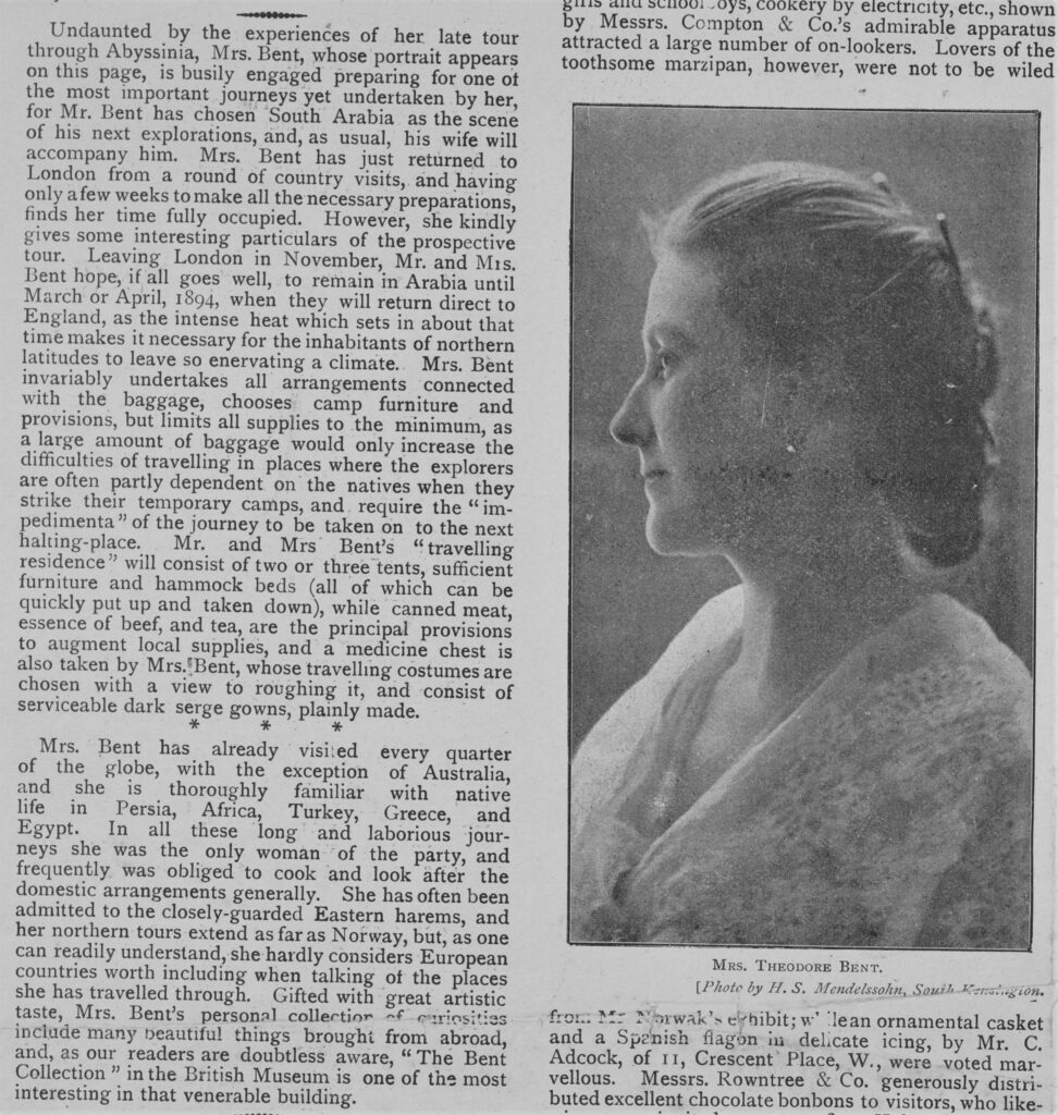 Mabel’s photographs of Bahrain ‘are amongst the earliest recorded… and are of some quality: in one of them Bent, looking like a gamekeeper who has strayed rather far from his customary beat, clad in deerstalker hat and tweeds, is revealed, entertaining Bahraini dignitaries at the Aali mounds.’ M. Rice (1984), Dilmun discovered. The early years of archaeology in Bahrain. London: Longman, pp. 67ff.