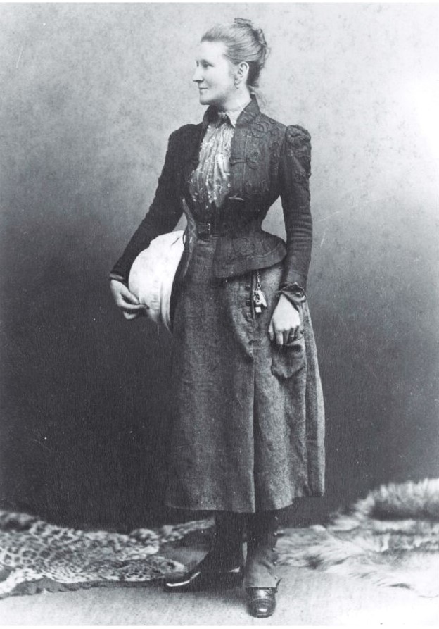“My travelling dress consists of a tweed coat and skirt, a pith hat, with breeches and gaiters. The skirt is made in pleats, and is so arranged as to act as riding habit when I am on horseback.” Mabel Bent dressed for travel. (Photo taken (pre 1895) in the studios of society-photographers, Russell & Sons)